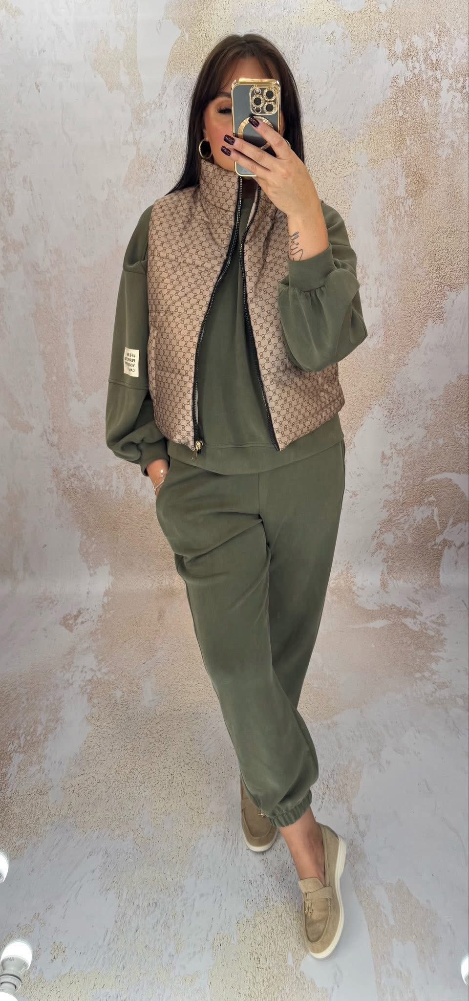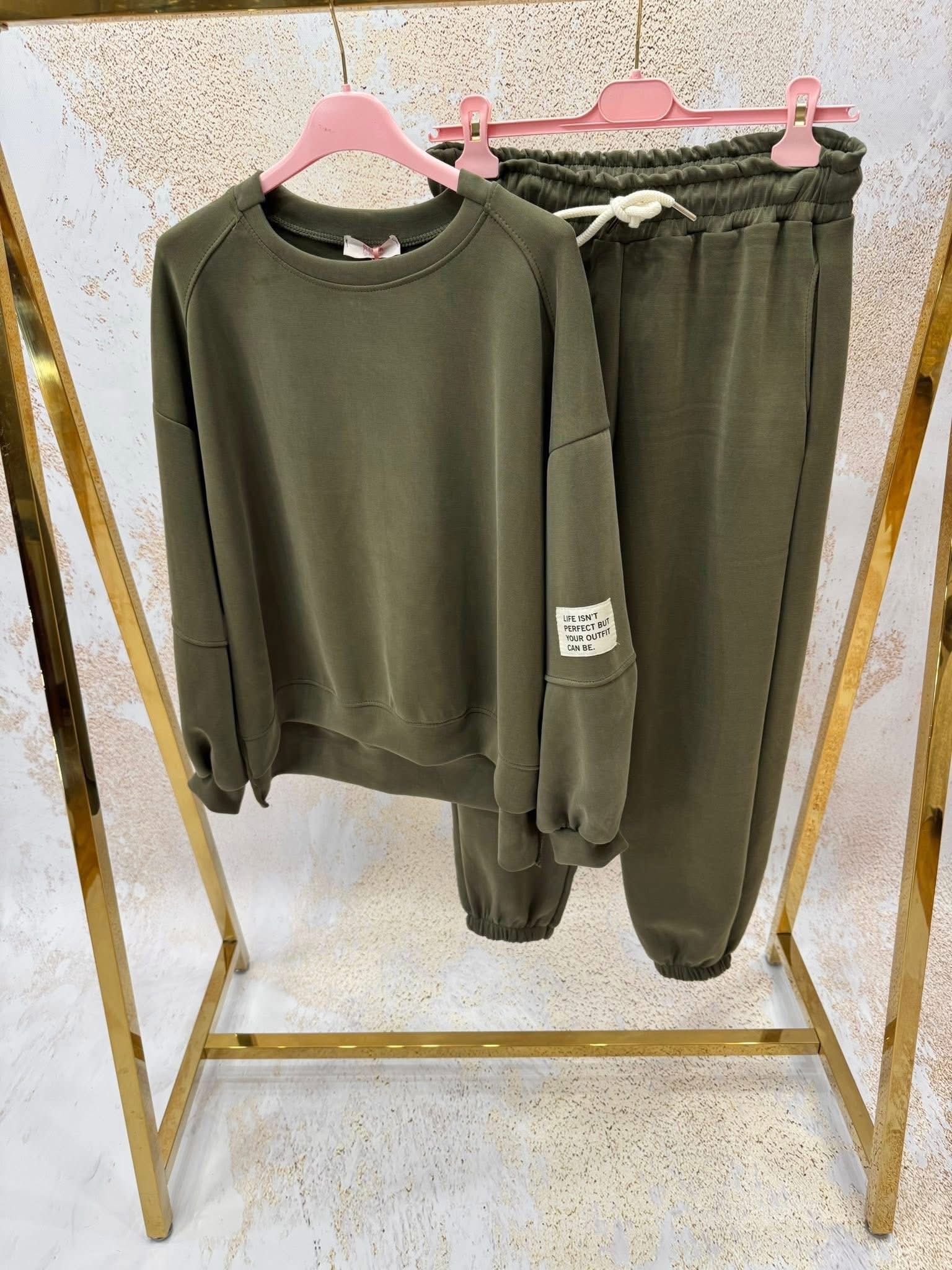 Drogie Panie, do sprzedania super komfortowy dres włoskiej marki Azara. Nowy, z metką. Przepiękny odcień khaki. . Materiał masełko lekki, milutki dla ciała. Skład: 46% wiskoza, 45 % poliester, 6% elastan.