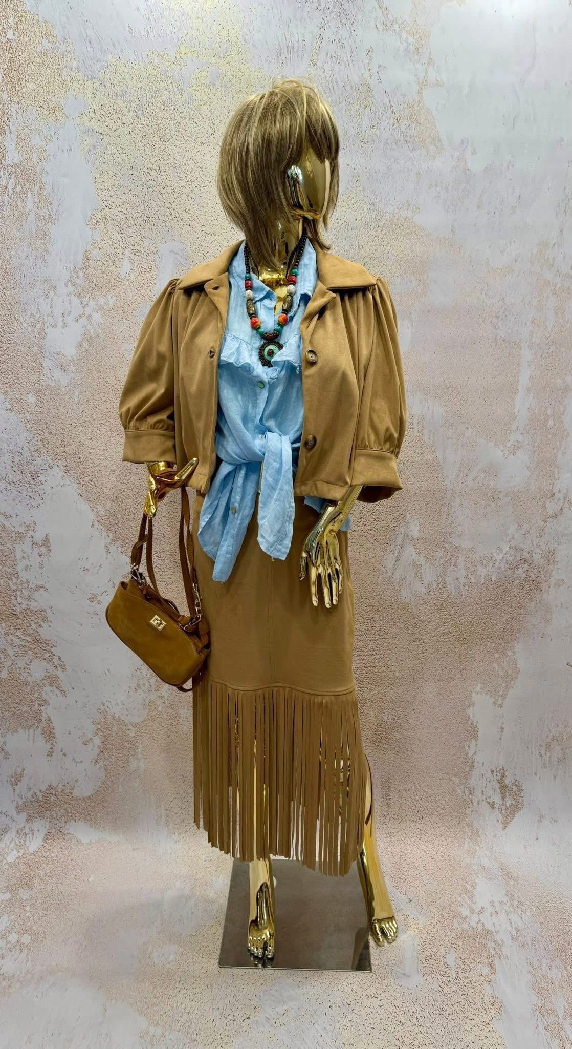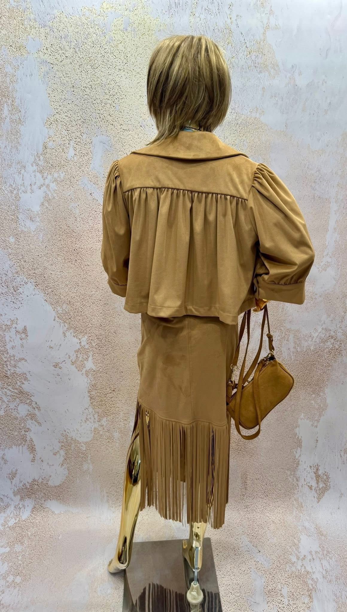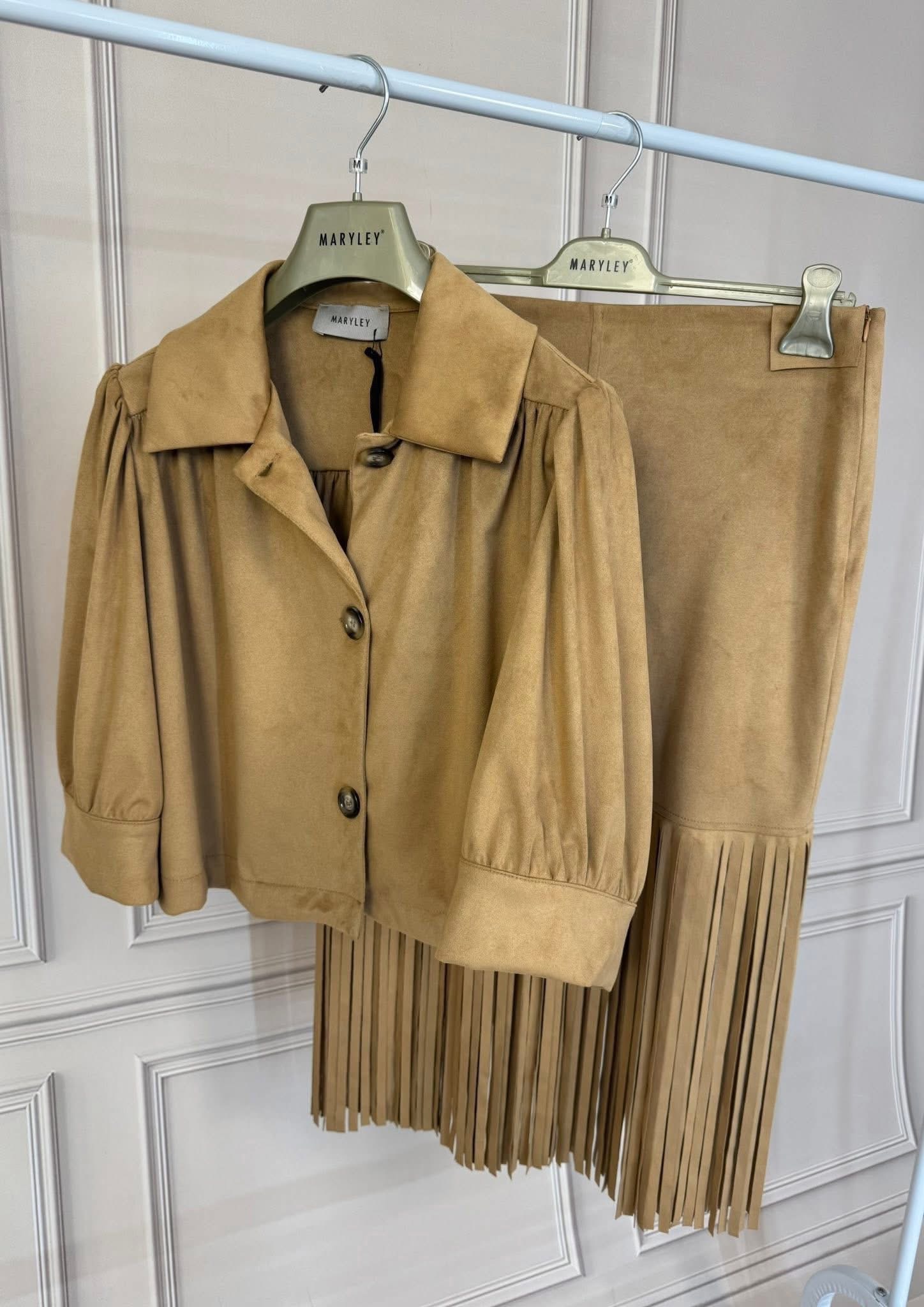 Drogie Panie, do sprzedania komplet w stylu boho z włoskiej marki Marley. Nowy, z metkami. Bomberka plus spódnica. Imitacja zamszu. Lekki, miły do ciała. Odcień kamelowy. Rozciąga się.